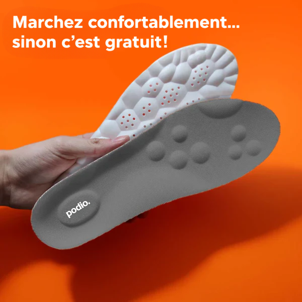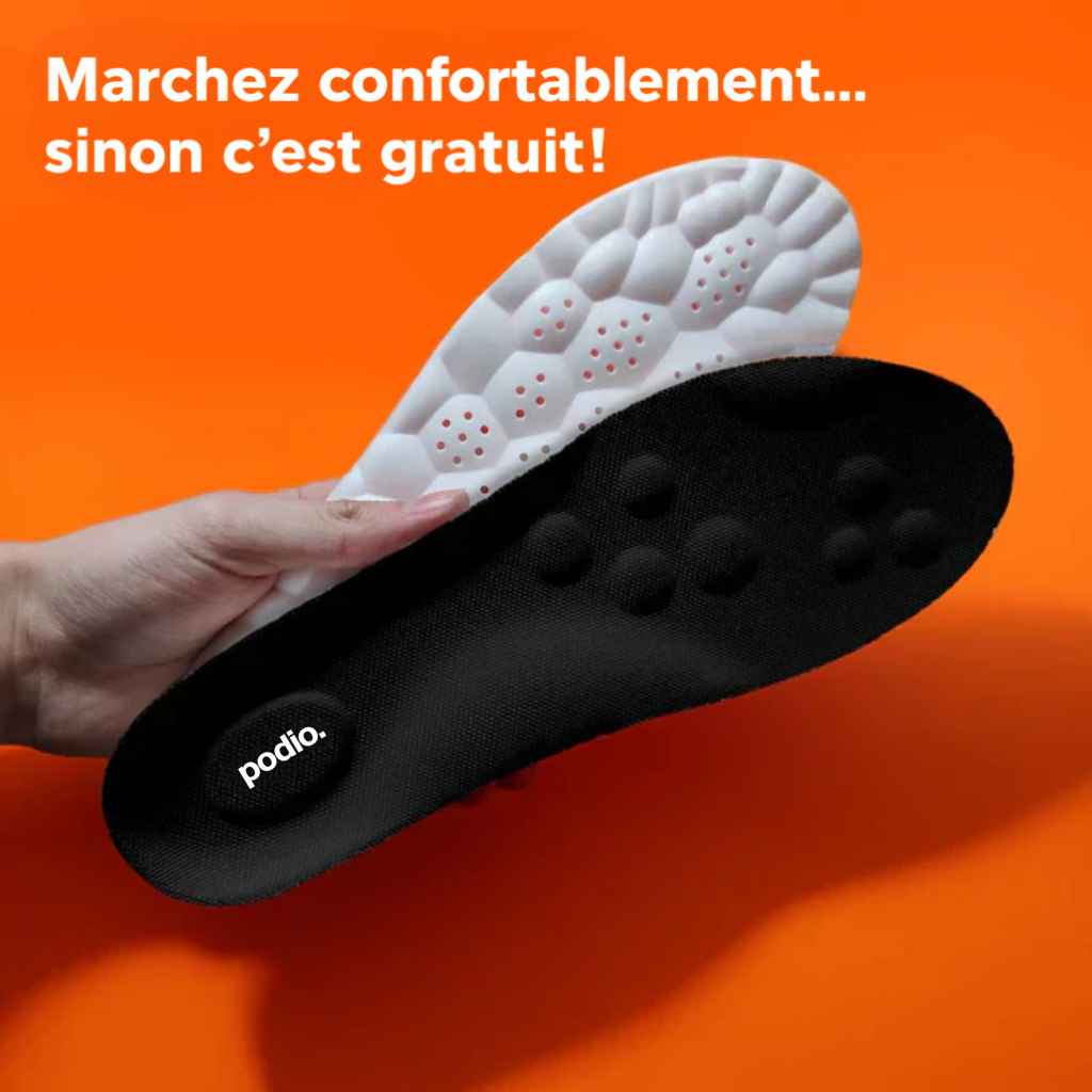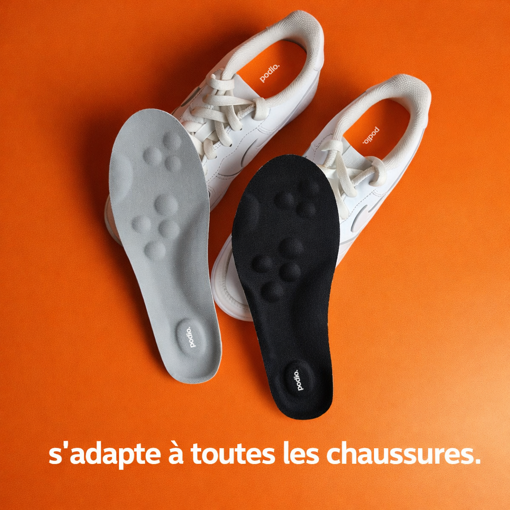 Découvrez les semelles Podio – le confort ultime pour vos pieds. Redécouvrez le plaisir de rester debout, de marcher et de vivre sans douleur aux pieds.